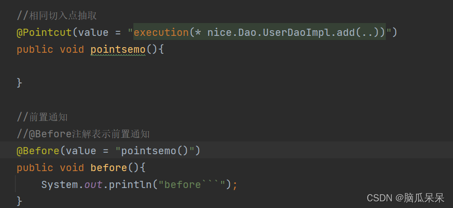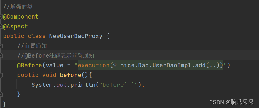 在增强类的里面,在作为通知方法上面添加通知类型注解,使用切入点表达式配置